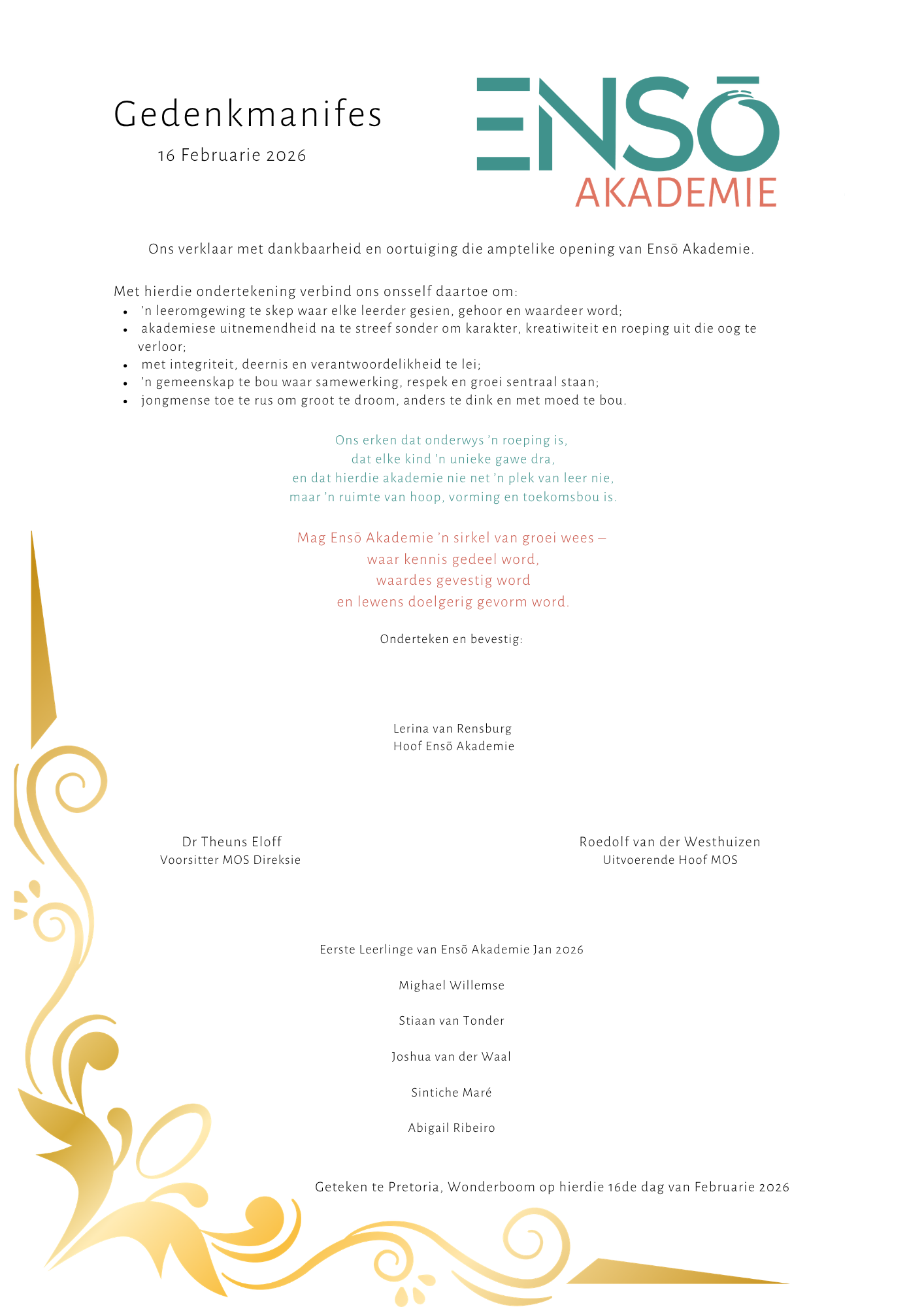 Op 16 Februarie 2026 is ‘n besondere dokument onderteken wat die geboorte van Ensō Akademie amptelik beseël het — die Gedenkmanifes.
